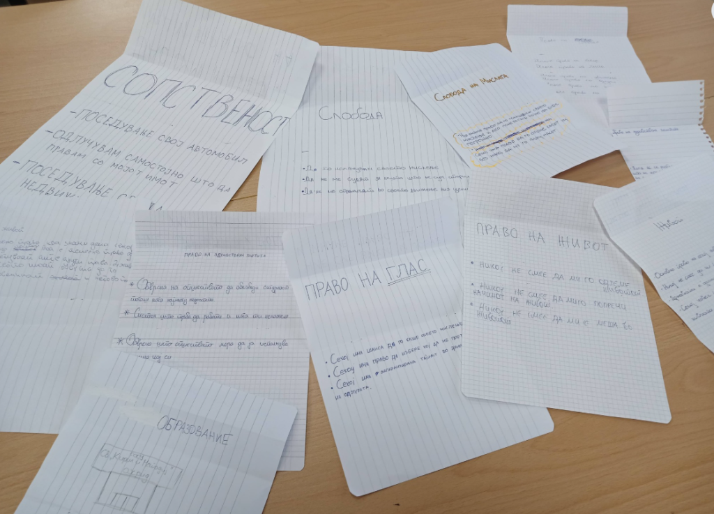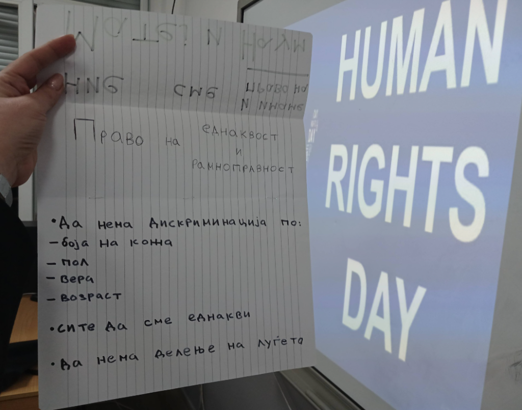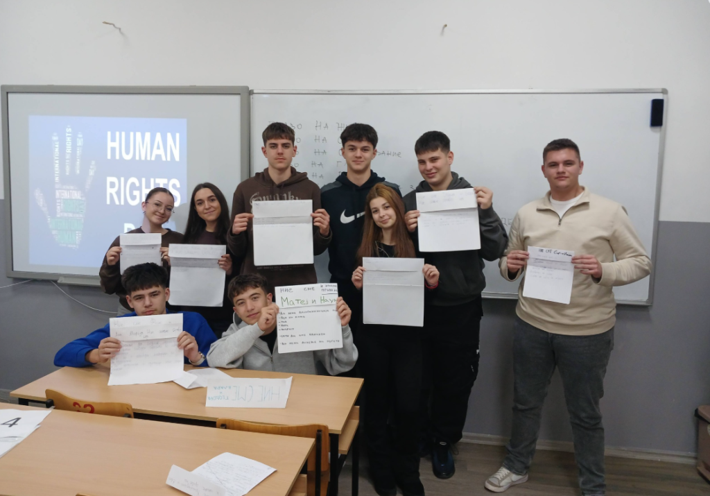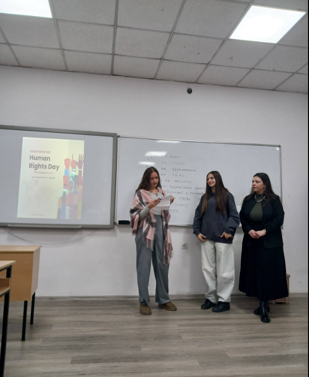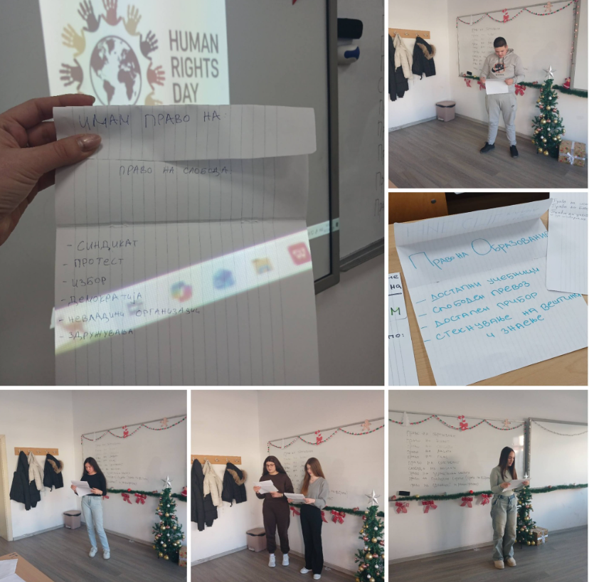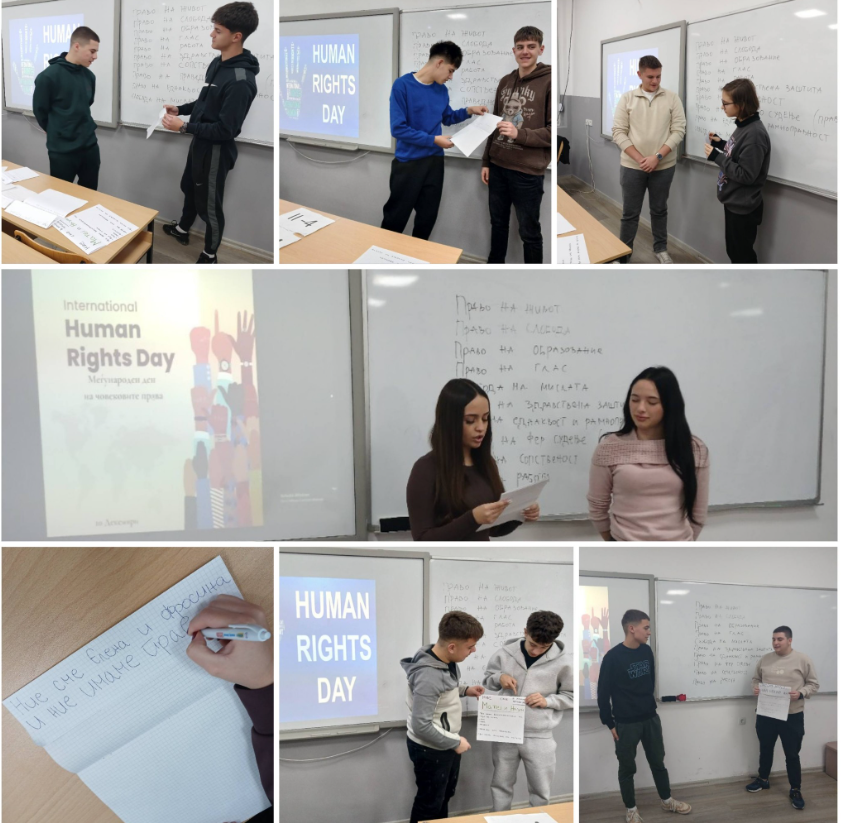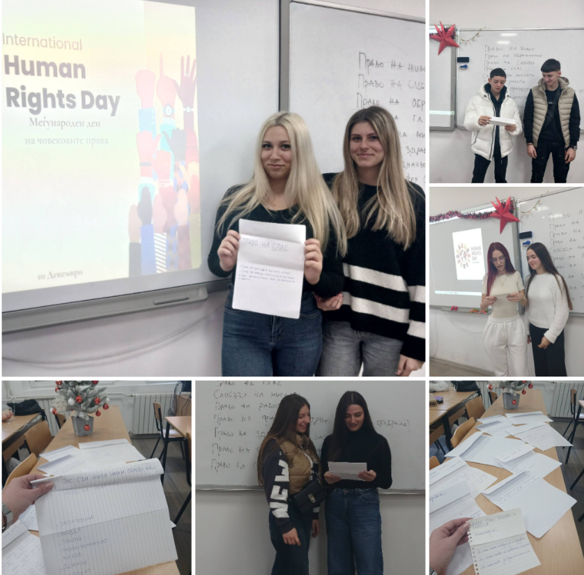По повод 10ти декември, меѓународниот ден на човекови права (International human rights day) и ден на усвојување на Универзалната декларација за човековите права, учениците од втора година, Економско-правна и трговска струка со проф. по Право, Надица Речкоска, презентираа права опфатени во македонскиот Устав кои исто така се дел од Универзалната декларација за човековите права.
